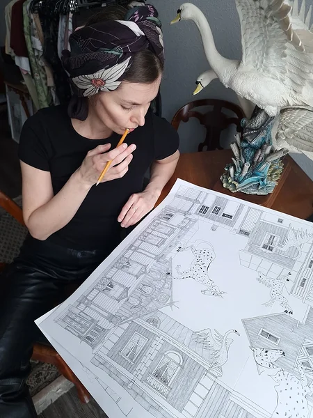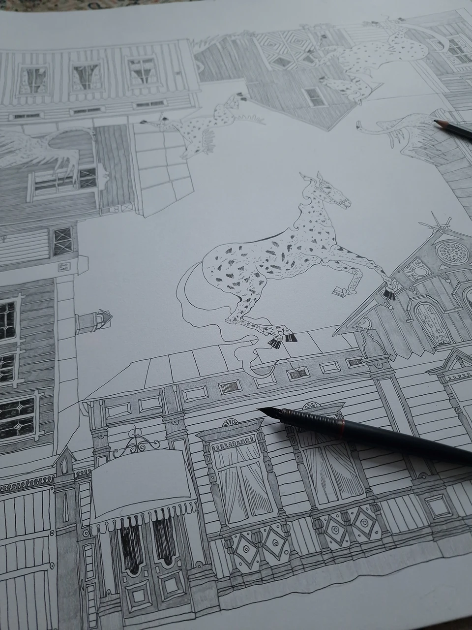 The collection is inspired by the enchanting world of Nordic wooden neighbourhoods. The artist visited historic wooden towns in Finland, including Rauma and Porvoo, where narrow streets, tightly clustered houses and façades shaped by layers of time provided rich material for the creation of patterns.